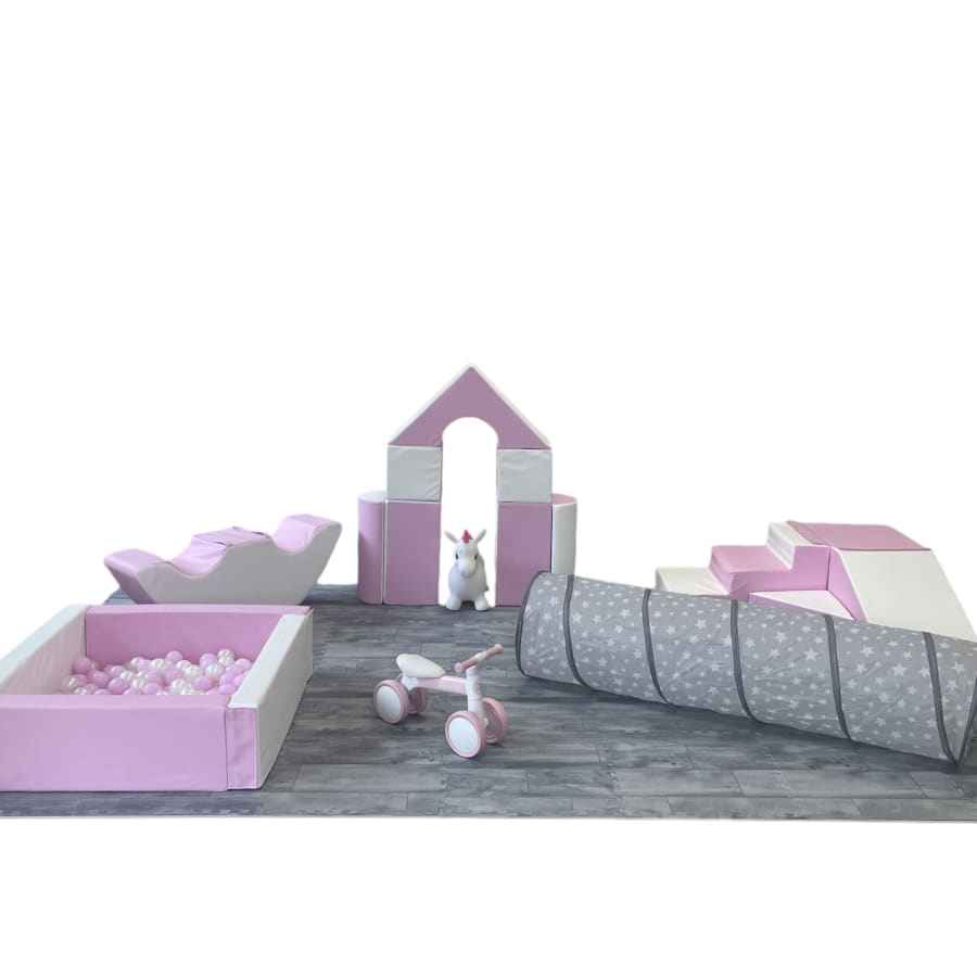 The Midi Soft Play Package Includes: Corner Step & Slide, Ball Pit with Balls, Double Rocker, Castle Blocks, Play Tunnel, Trike and Hopper. All appropriate mats are supplied.