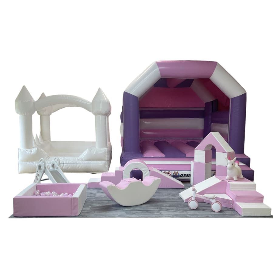 The Maxi+ Package includes: Corner Step & Slide, Double Rocker, Castle Blocks, Climb & Roll, Trike & Hopper, Slide, Play Tunnel, Luxury Ball Pond with balls and Any Selected Bouncy Castle. All appropriate matting supplied.